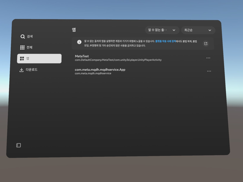 하면 메타 퀘스트에서 유니티 앱이 실행되는 것을 확인할 수 있습니다!