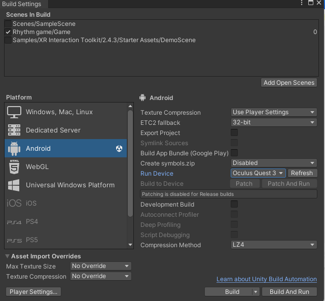 빌드환경을 안드로이드로 변경하고 옆의 Run Device를 연결된 메타퀘스트로 연결해 줍시다.