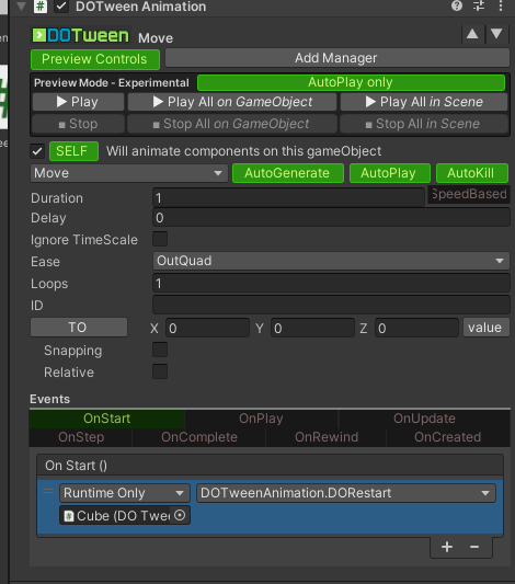 이것을 DoTween에서 Tween이라는 객체를 이용하여 실행하는데 아래의 인스펙터 창에서 확인 가능합니다.