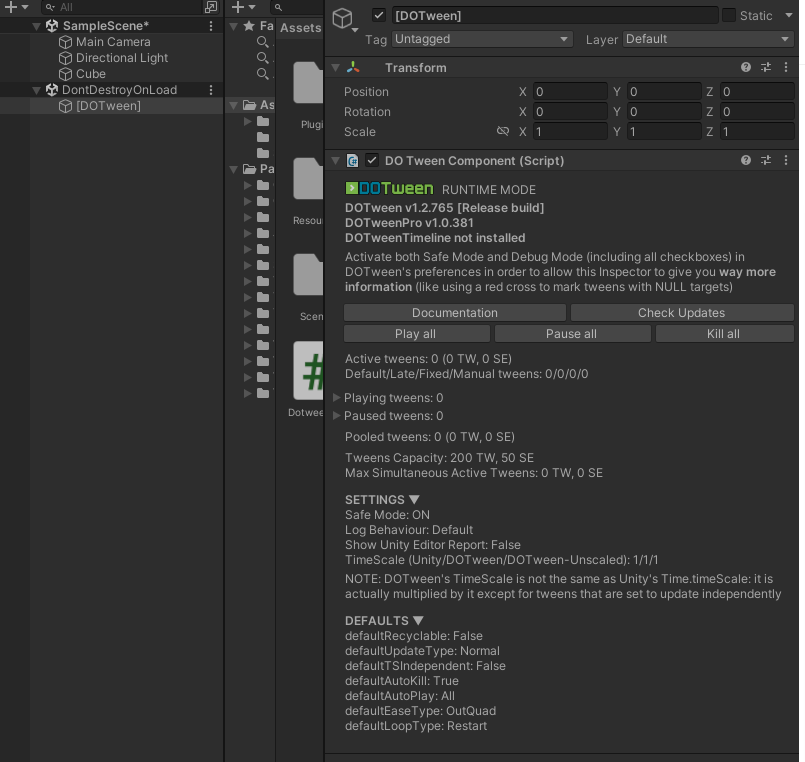 씬 자체에 DoTween이라는 DontDestroy 오브젝트가 생성됩니다.
