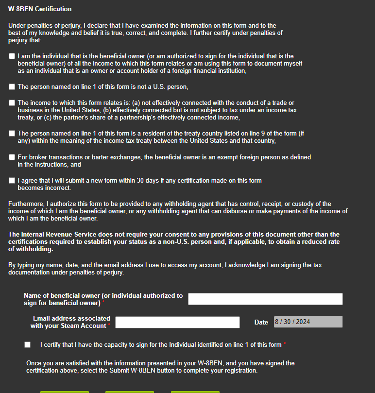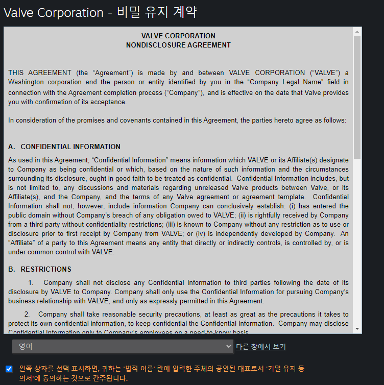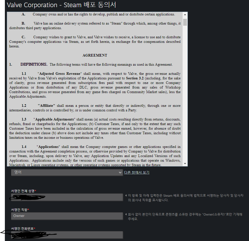 스팀 배포 동의서에 동의를 해줍시다.