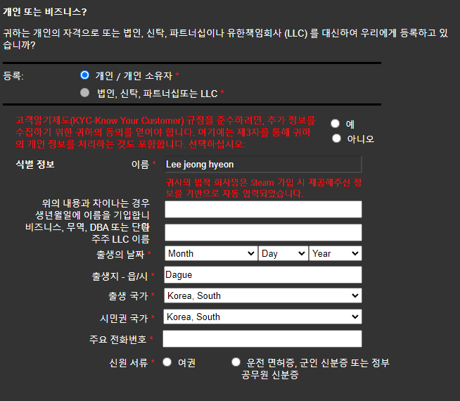 법적이름은 나중에 세금관련, 그리고 본인 인증관련으로 사용될 수도 있으니