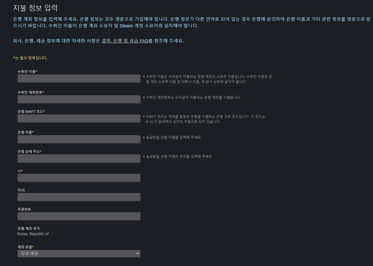 수취인 이름은 사용할 계좌의 소유주 이름으로 등록해줍시다. (한글로 작성해도 되는지는 확인하지 못했습니다...)
