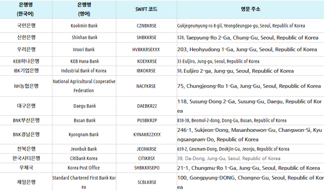 다음은 은행이름과 은행 swift 코드인데 이는 아래에서 찾아 정확히 입력해 주시면 됩니다.