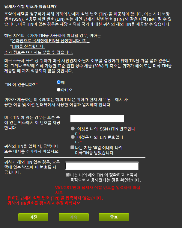 마지막쯤 아래처럼 납세자 식별 번호가 있는지 물어보는 페이지가 있습니다.