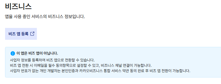 4. [비즈앱 등록]를 누르고, 여기서 [REST API 키]를 복사해서 사용합니다.