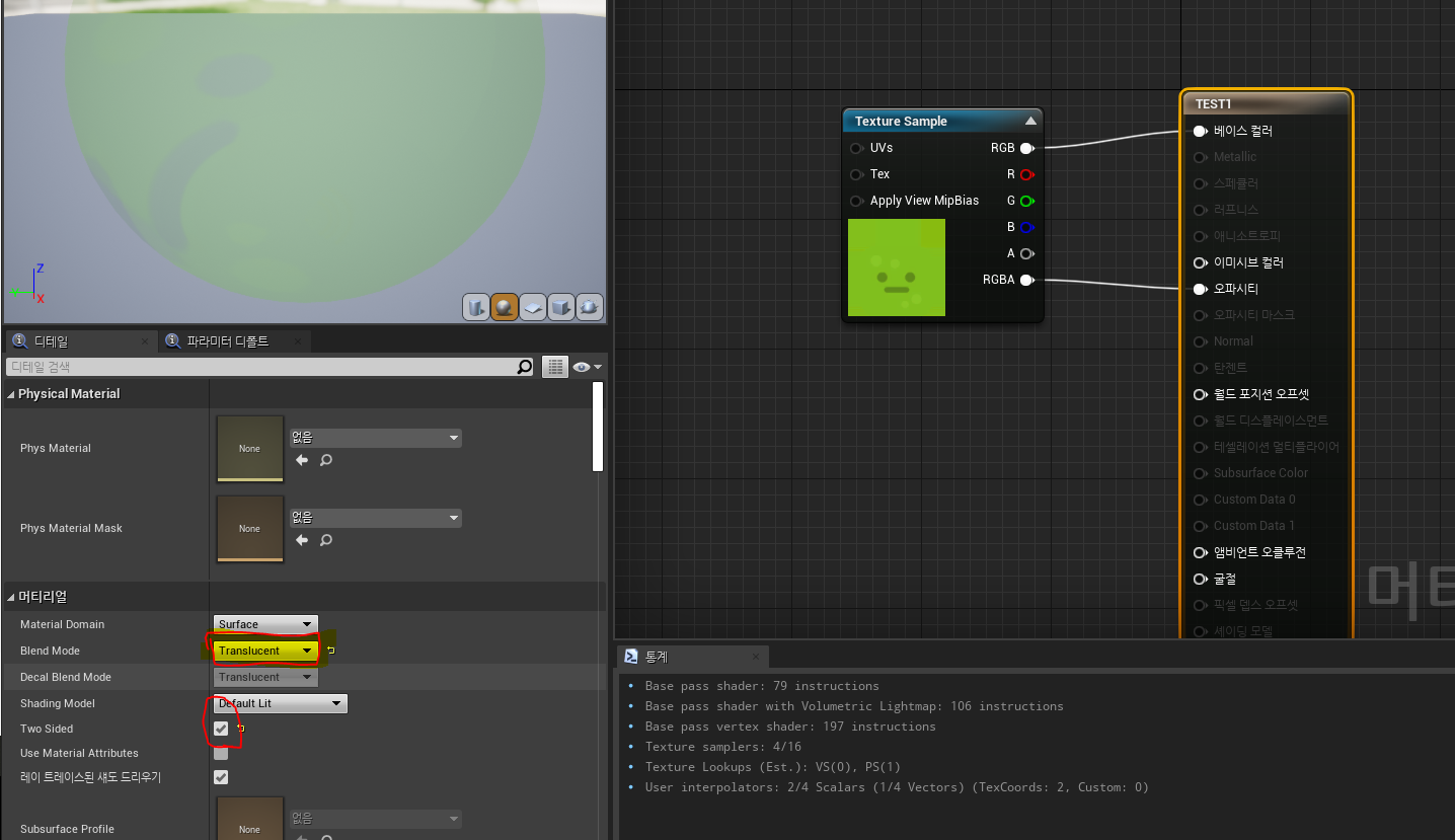 1. 다시 왼쪽으로 돌아가 디테일을 보시면 BLEND MODE가 있을껍니다! 이걸 TRANSLUCENT 모드로 변경해주고